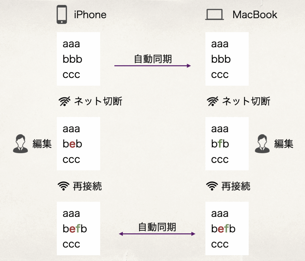 「ネットに再接続されたタイミングでバックアップ処理が走る」という仕組みは比較的想像しやすいのですが、問題はそのときの テキストのマージ処理 です。